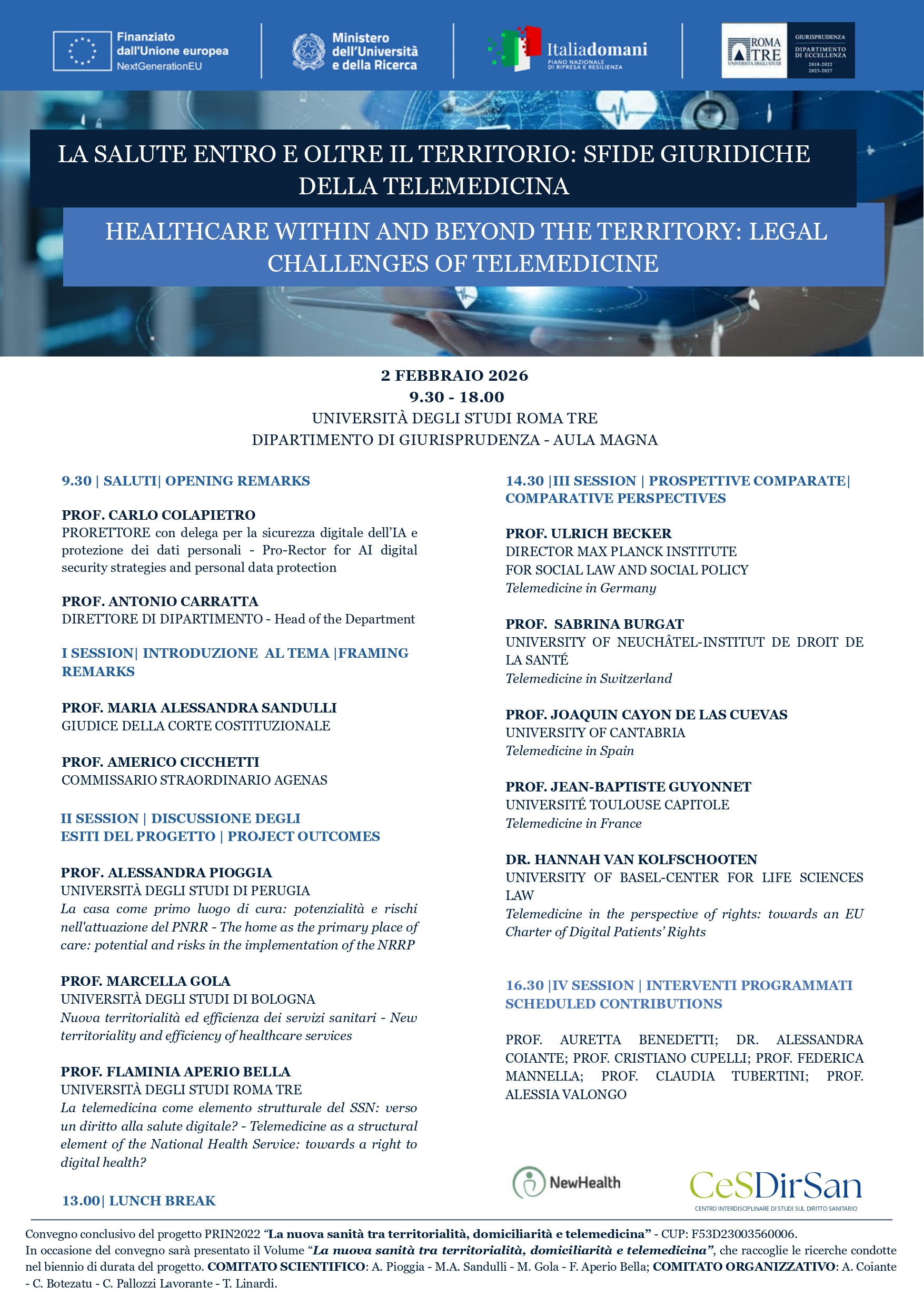 Convegno finale PRIN NEW HEALTH -“Healthcare within and beyond the territory: legal challenges of telemedicine – La salute entro e oltre il territorio: sfide giuridiche della telemedicina”,